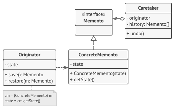 중간 인터페이스에 기반한 구현 중첩 클래스들이 없는 경우, 케어테이커들이 명시적으로 선언된 중개 인터페이스를 통해서만 메멘토와 작업할 수 있는 규칙을 만들어 메멘토의 필드들에 대한 접근을 제한할 수 있다. 해당 인터페이스는 메멘토의 메타데이터와 관련된 메서드들만 선언한다.