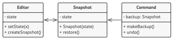public class Command { private Stack<Snapshot> backup = new Stack<>(); public void makeBackup(Editor editor) { backup.push(editor.createSnapshot()); } public void undo() { Snapshot snapshot = backup.pop(); if (snapshot != null) { snapshot.restore(); } } }Client