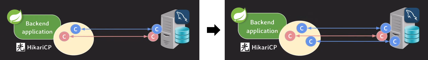 하나의 애플리케이션만 존재한다면 connection을 연결하는데 문제가 없지만, 클라이언트 요청이 많아져서 애플리케이션 서버를 늘릴 경우, 이미 기존 애플리케이션에서 connection을 최대로 맺고 있기 때문에, 새로운 애플리케이션과의 연결이 불가능해진다.